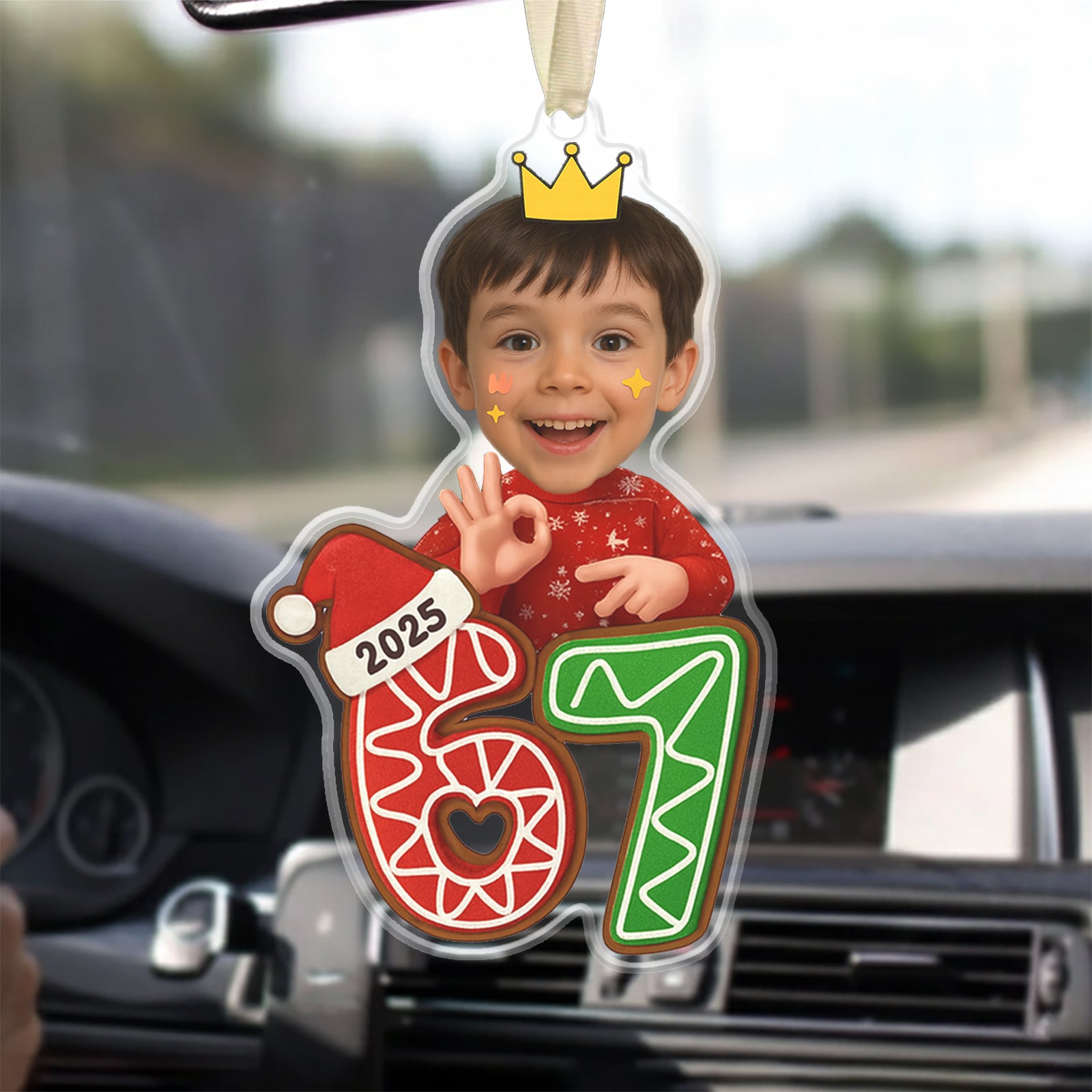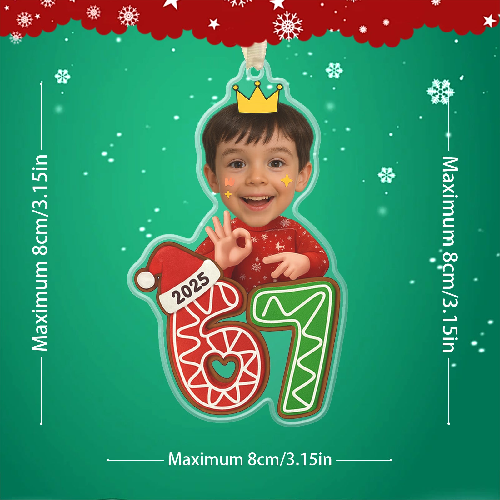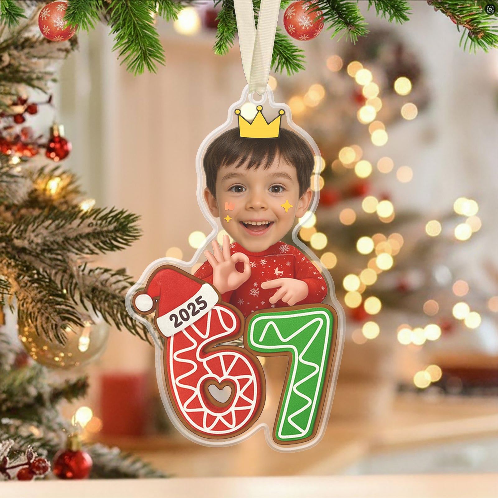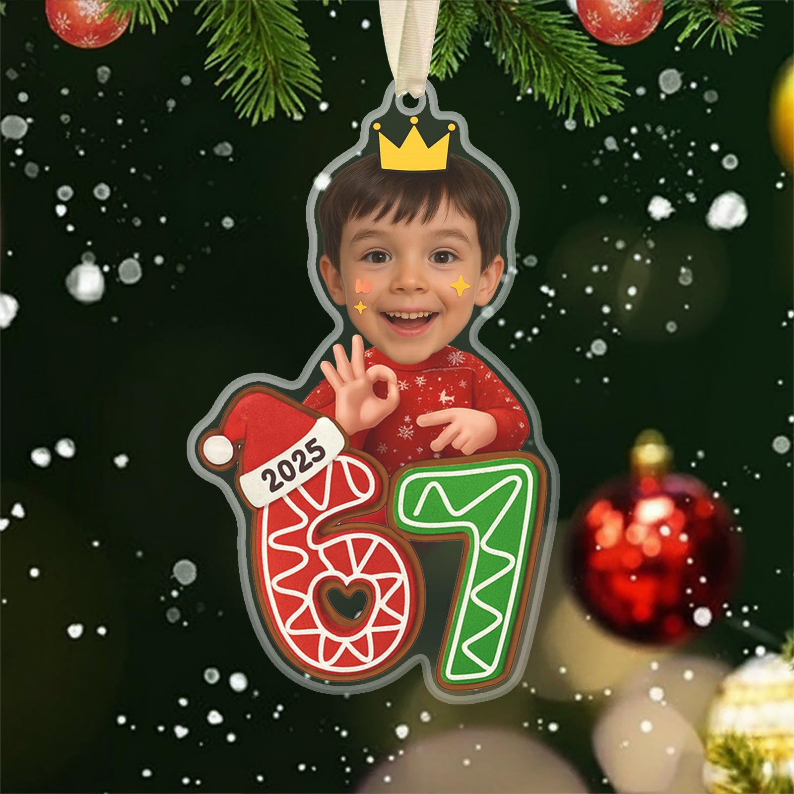 Your Face, The Viral Trend: This ornament supports photo face customization, letting you or your child become the central figure standing on the festive 67 gingerbread numbers.