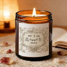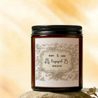 With its elegant vintage-inspired label and floral detailing, this candle is designed to feel timeless, sentimental, and gift-ready. Made in an amber glass jar with soy wax and a cotton wick, it brings a warm glow and cozy atmosphere to any space while honoring a special moment in the couple’s story.