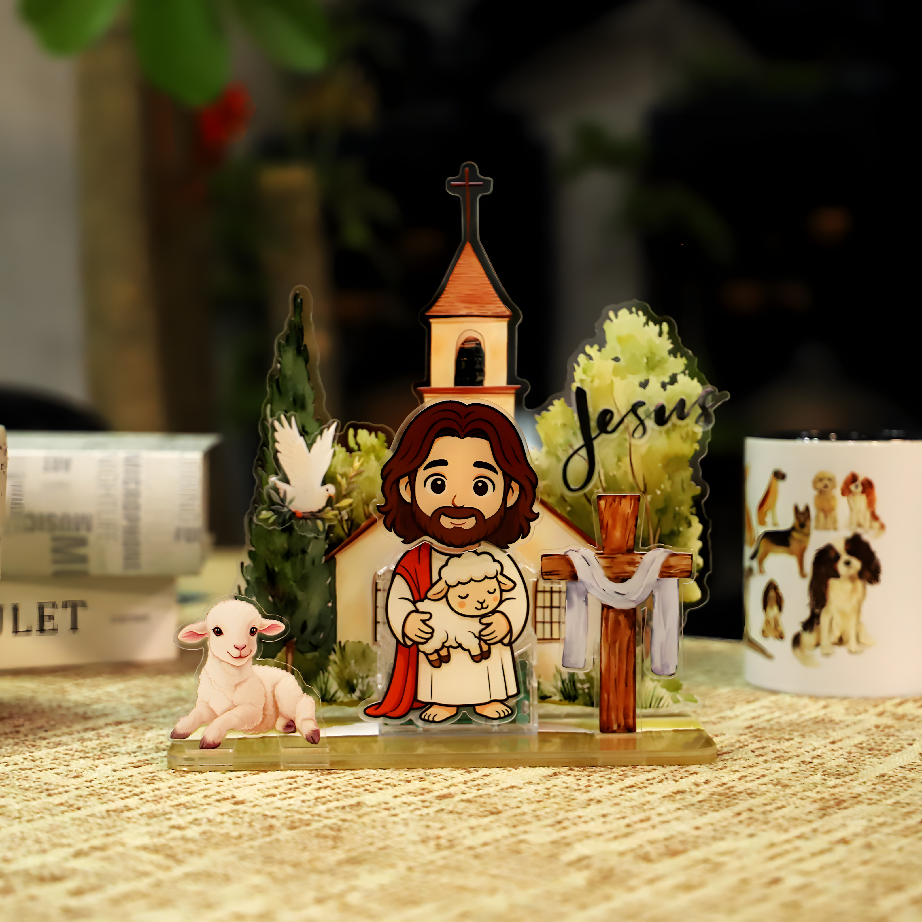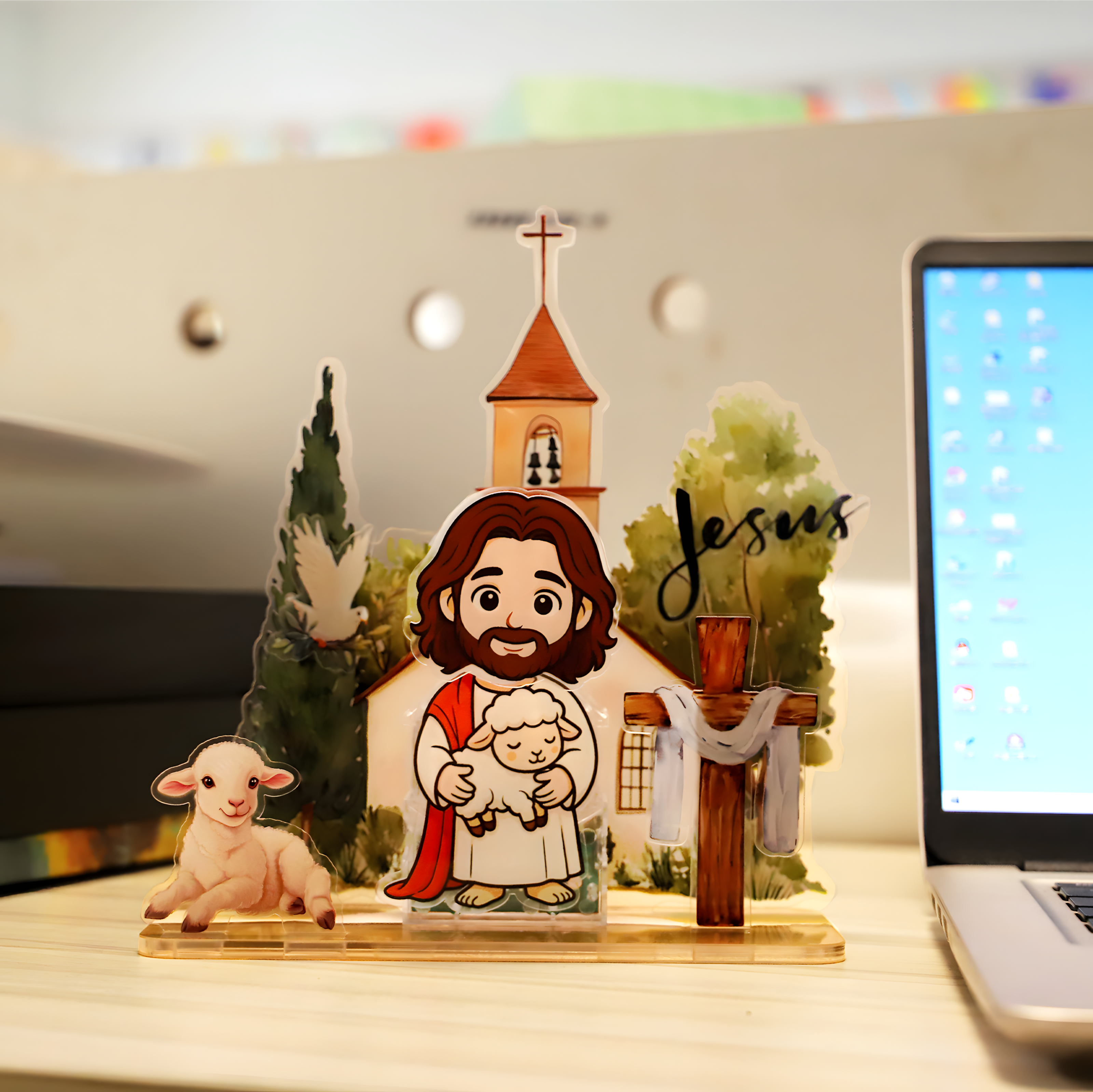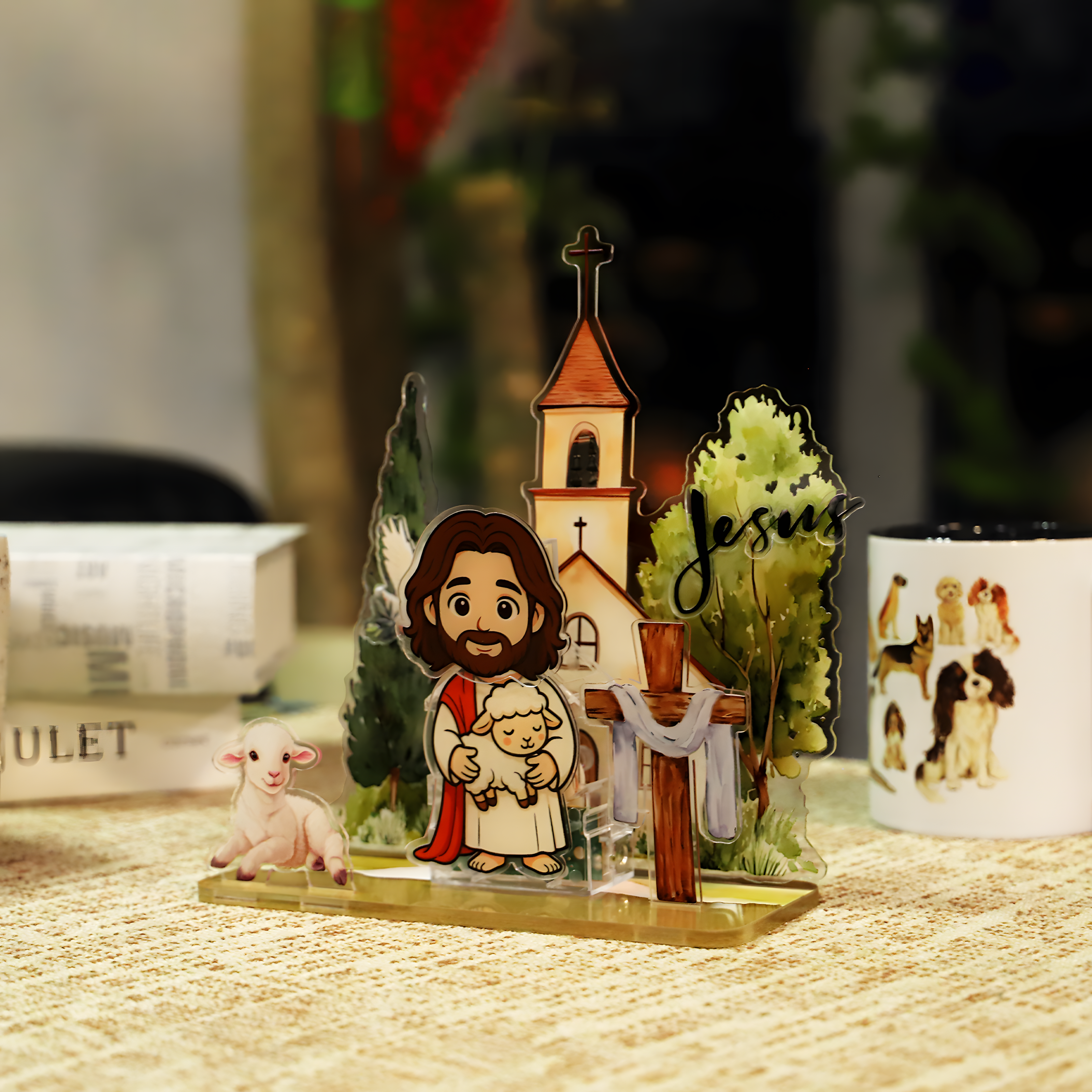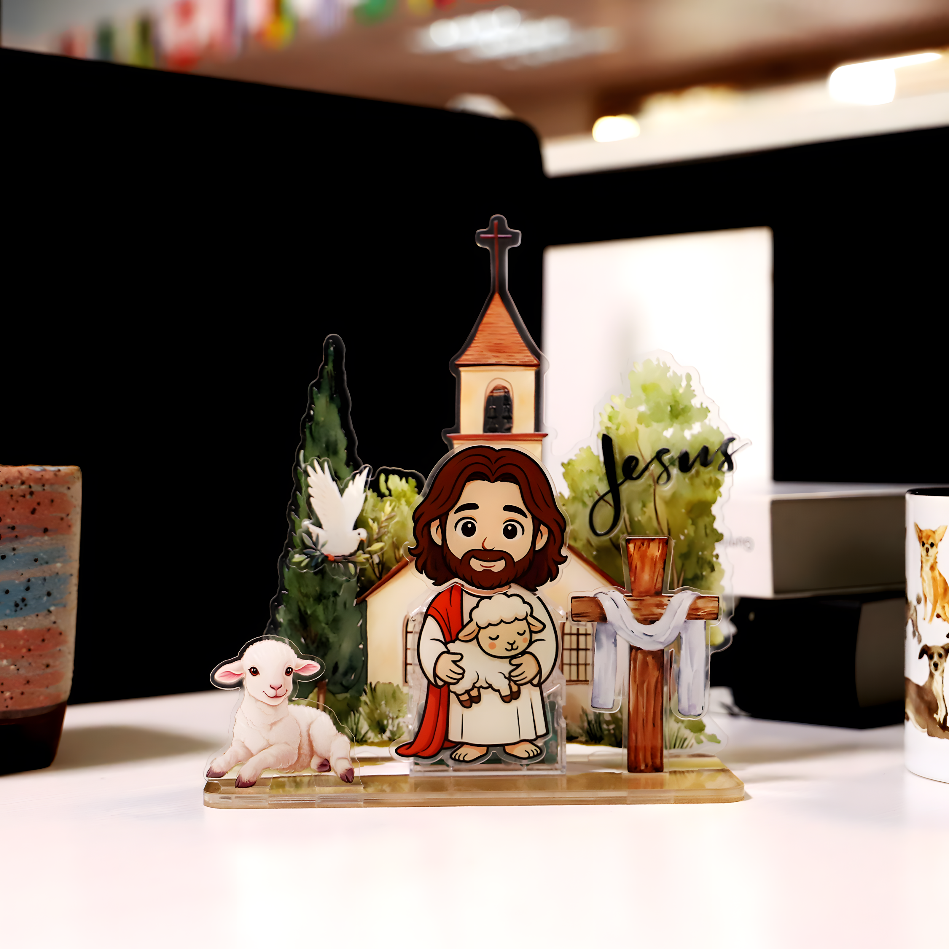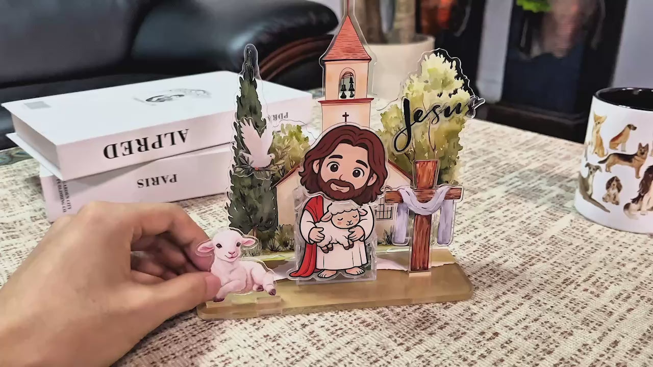 3D Depth Effect: The display is composed of multiple flat acrylic pieces (Church, Trees, Cross, Lamb, and Jesus) that slot securely into the base, creating a stunning, three-dimensional layered scene.