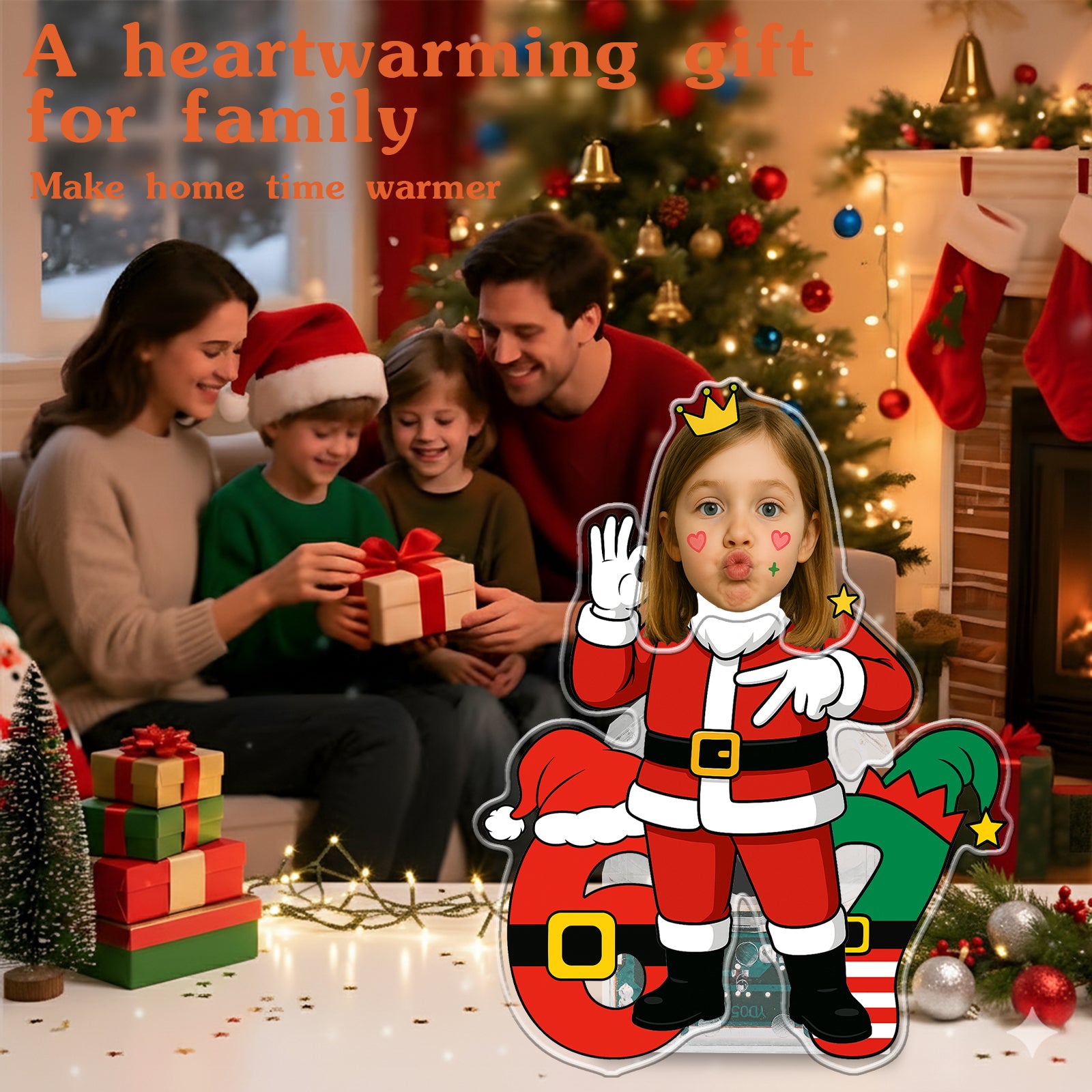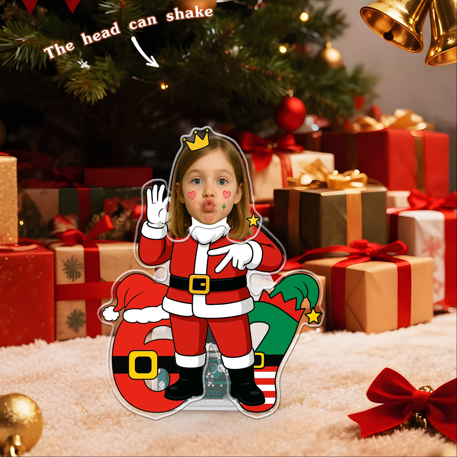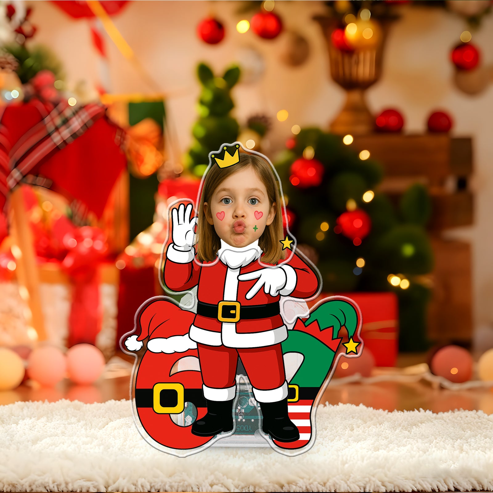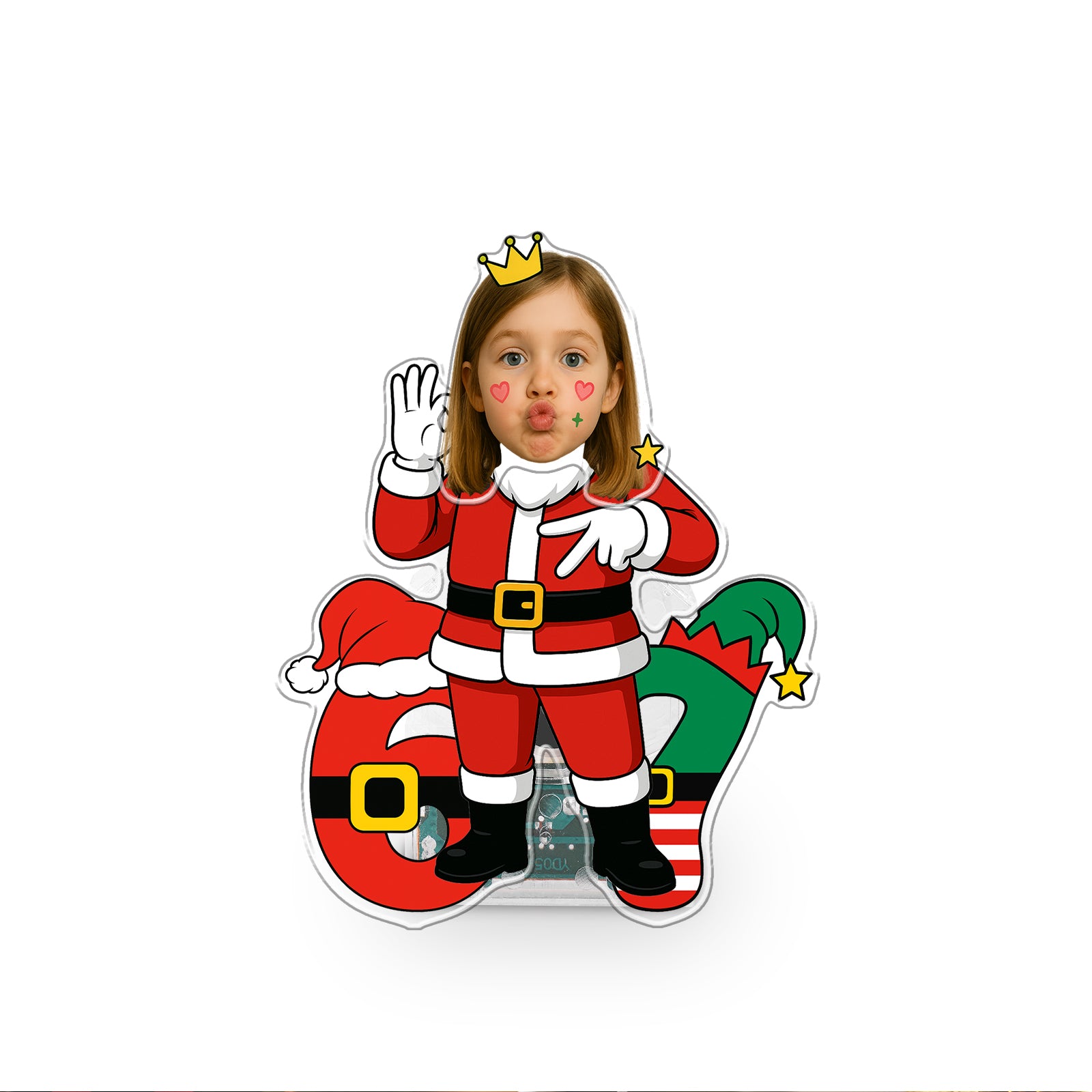 This holiday season, give a gift with true personality and dynamic movement! The Wobblejoy™ 'Santa 67 Vibe' Keepsake is a three-dimensional, personalized display that brings a unique blend of festive cheer and iconic internet culture to any space. This fun piece features your personalized face wearing a playful crown, dressed in a Santa suit, confidently displaying the unmistakable "67 Hand Gesture". Standing beside giant numbers styled after Santa's suit and elf gear, this item is guaranteed to bring hype and laughter to your holiday decor.