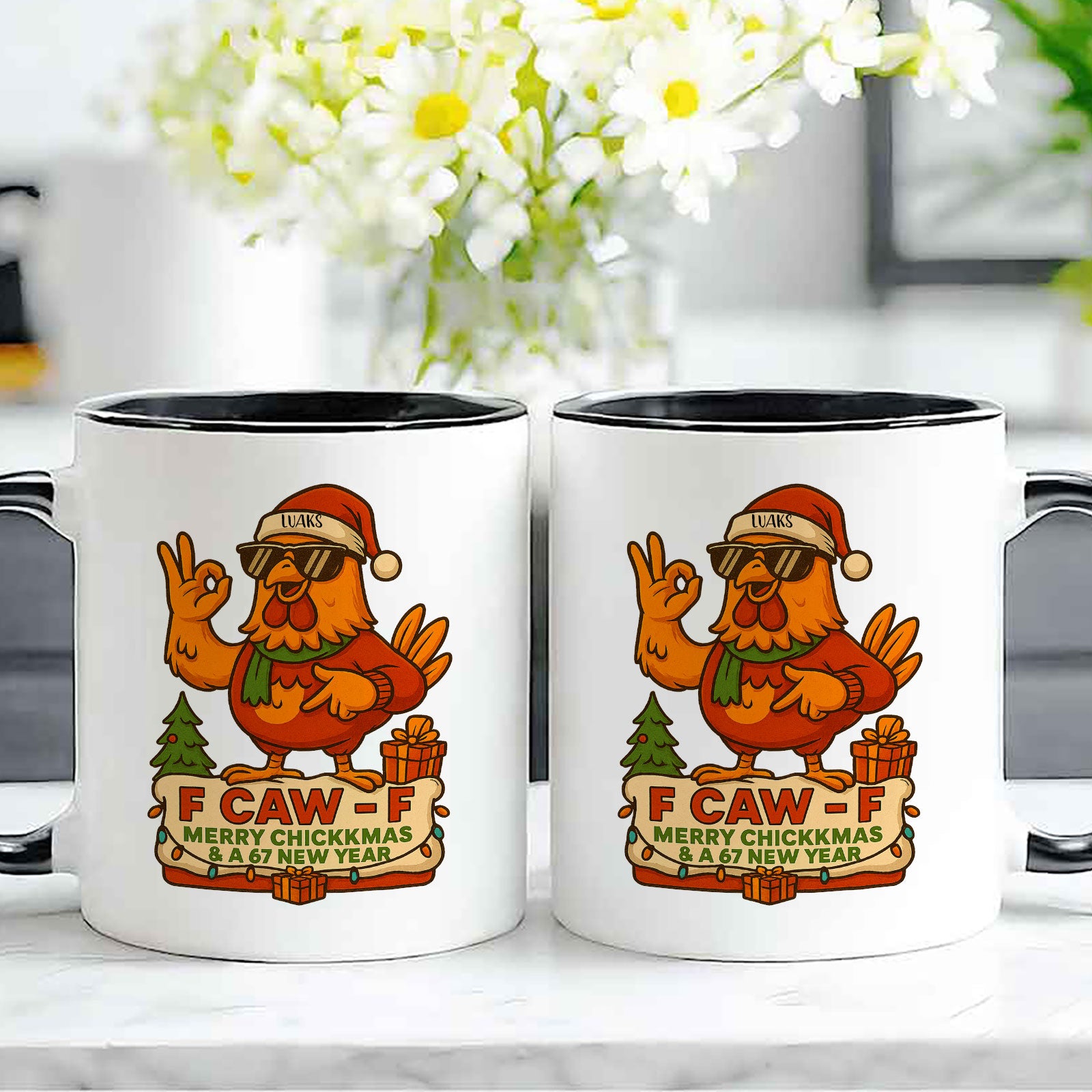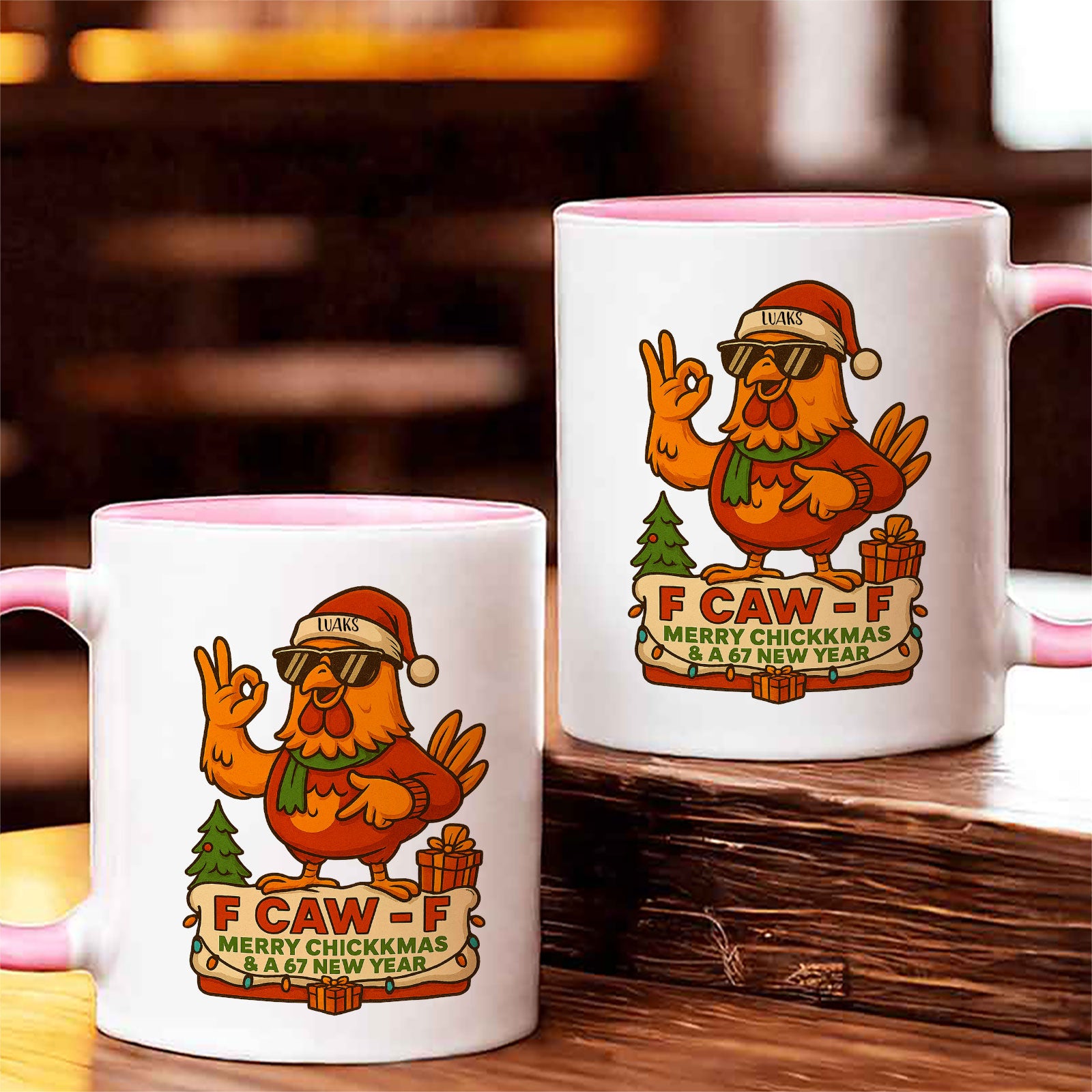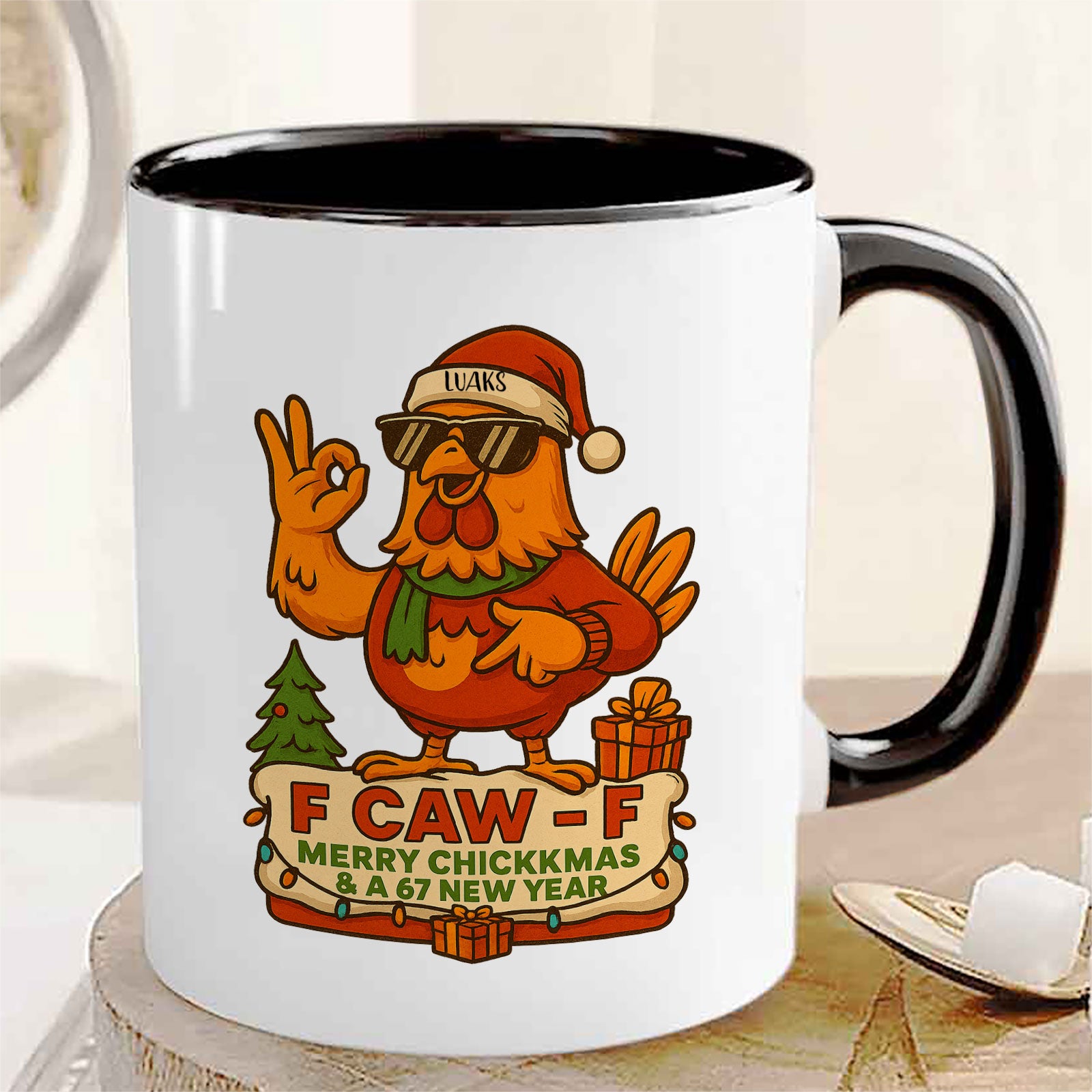 The mug’s bold message, “F CAW F,” along with the holiday cheer of “MERRY CHICKKMAS & A 67 NEW YEAR,” makes this a one-of-a-kind gift. The recipient’s customized name sits proudly on the Santa hat, making them the star of this hilariously real holiday greeting. It’s the ultimate stocking stuffer for the friend or family member who always appreciates a bit of attitude.