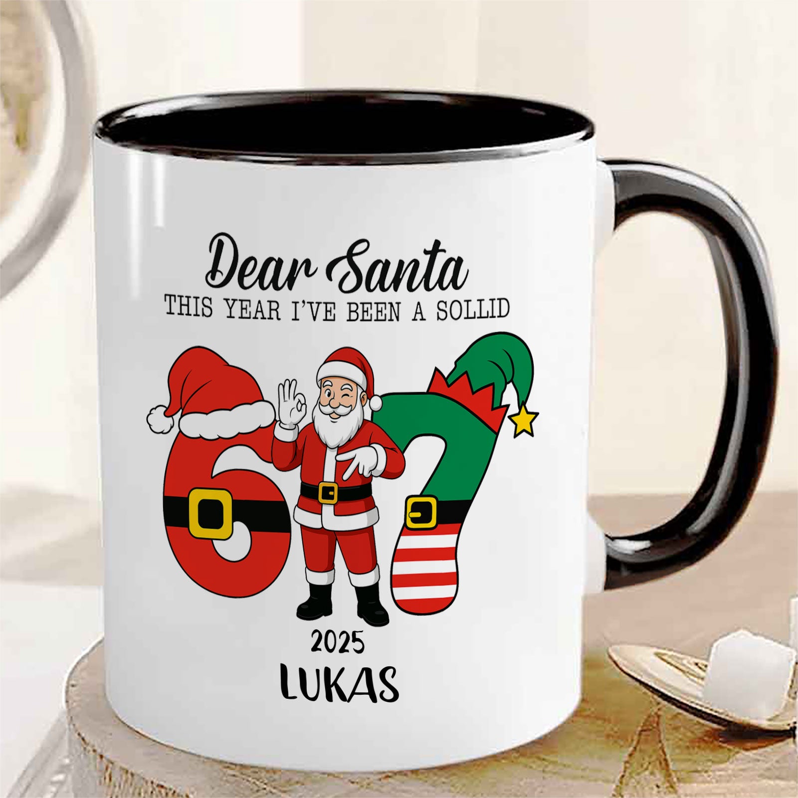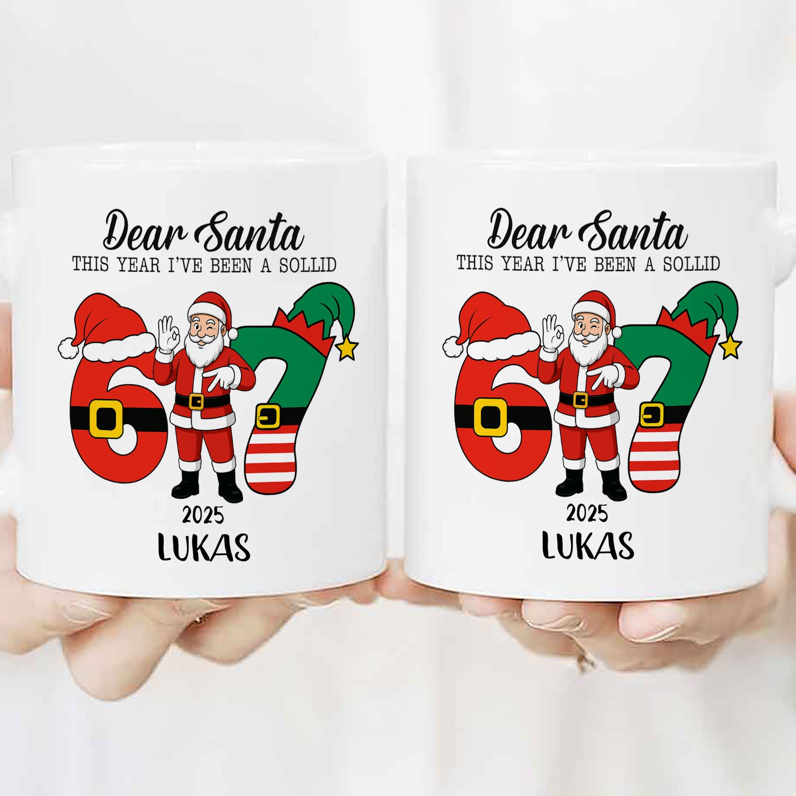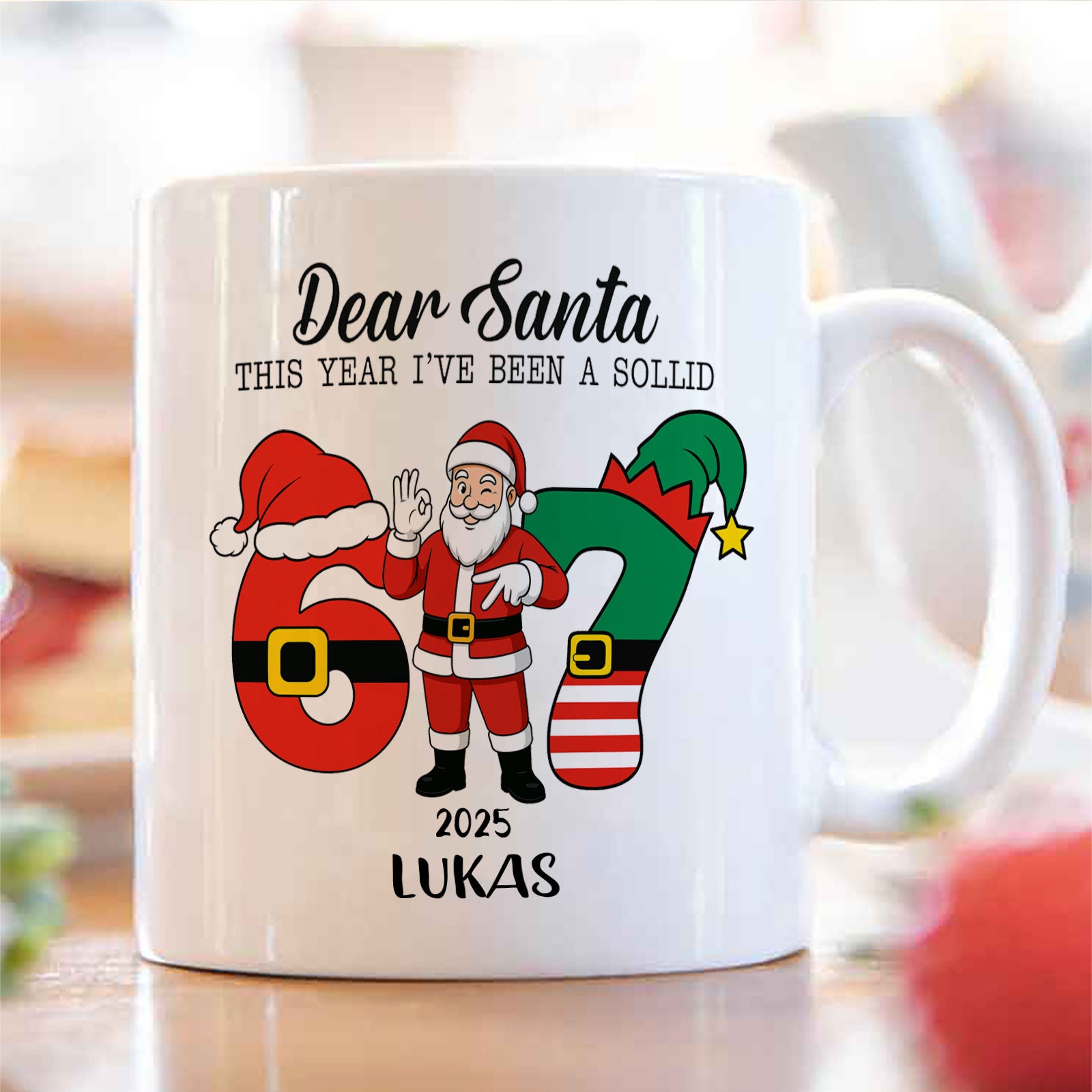 The mug’s central message, "Dear Santa, THIS YEAR I'VE BEEN A SOLID [67]," combines playful self-praise with the viral "67 Vibe." The customizable Year (2025) and Name (LUKAS) at the bottom make this a unique, annual Christmas trophy. Santa himself is featured between the '6' and '7' numerals, giving a thumbs-up and wearing the signature 67 belt buckle!