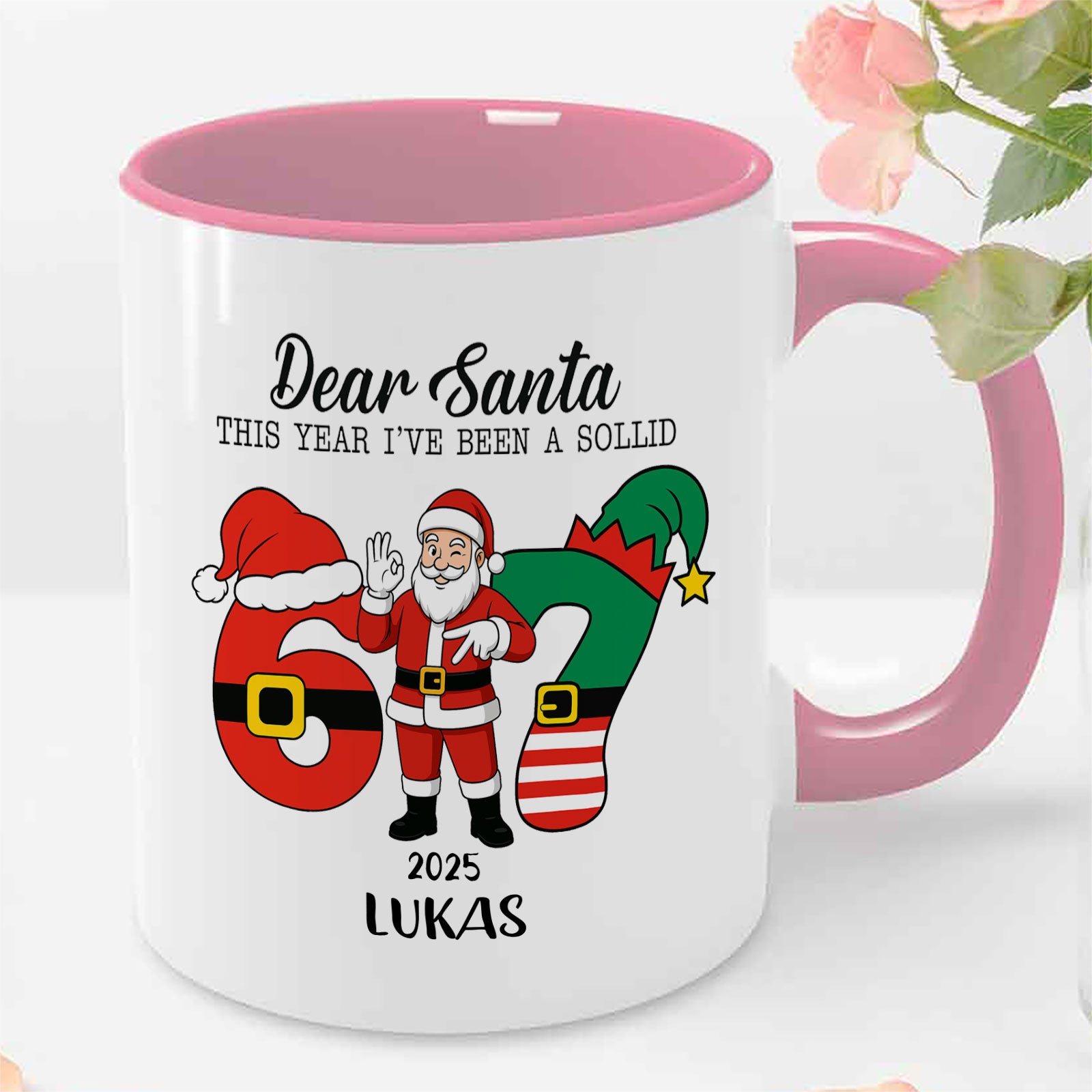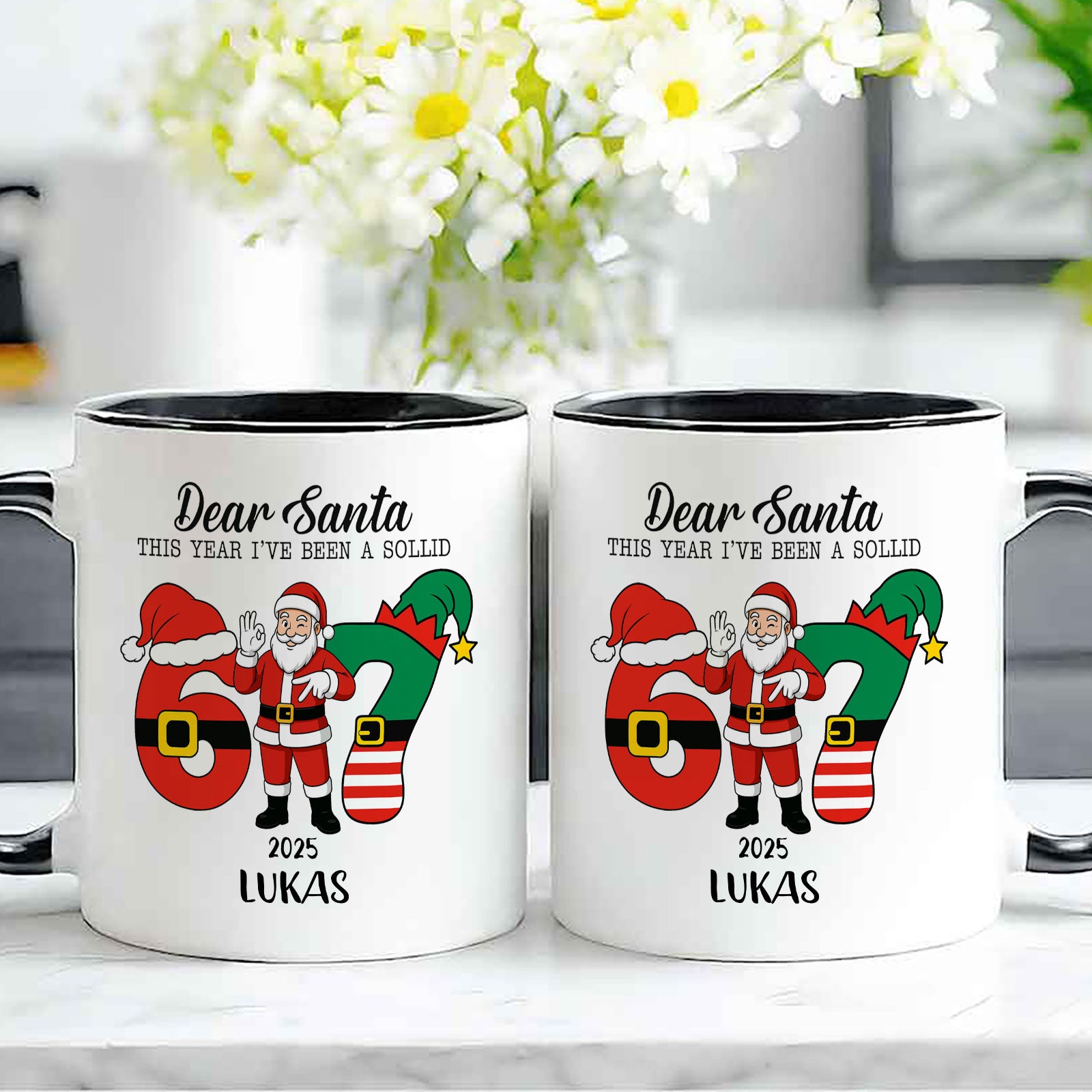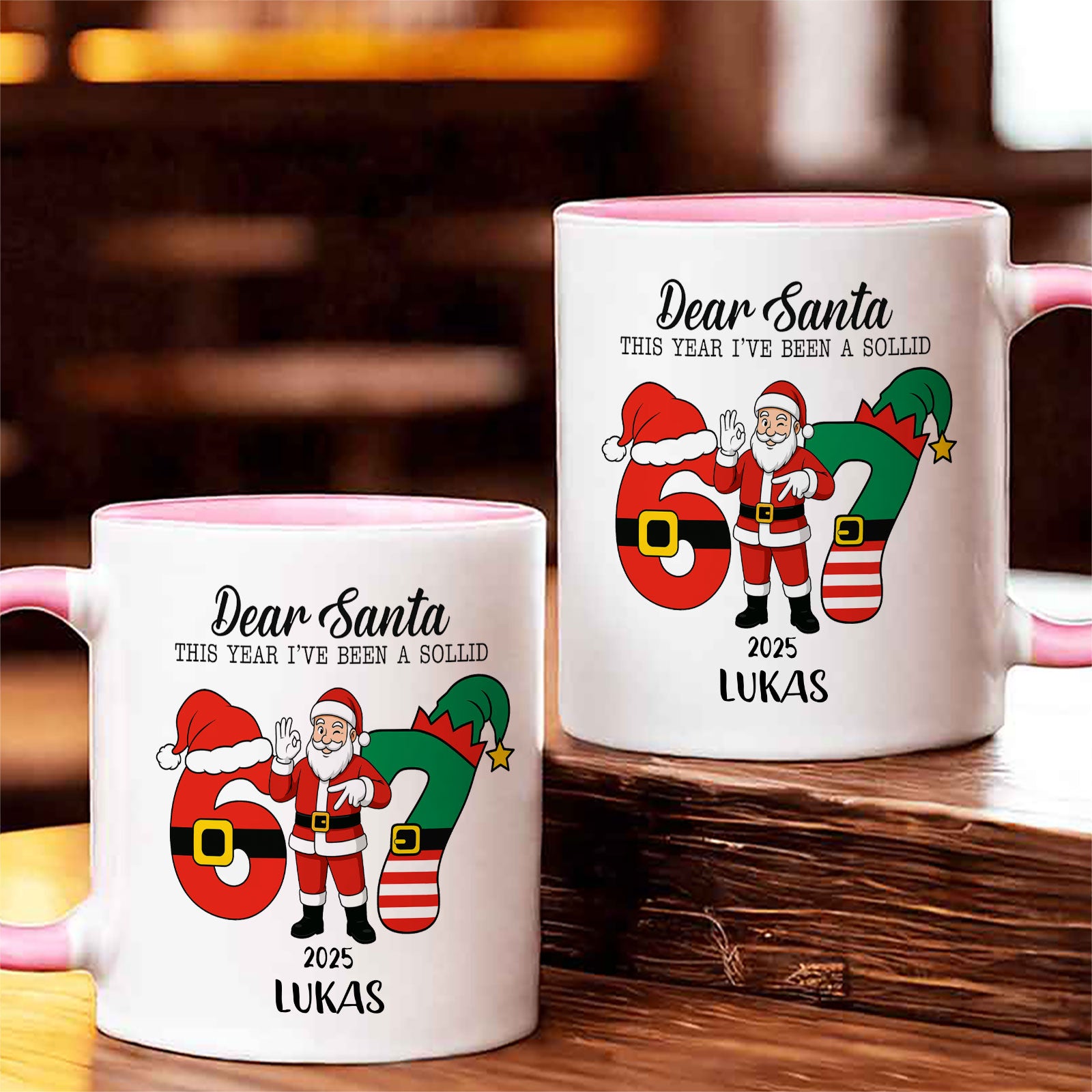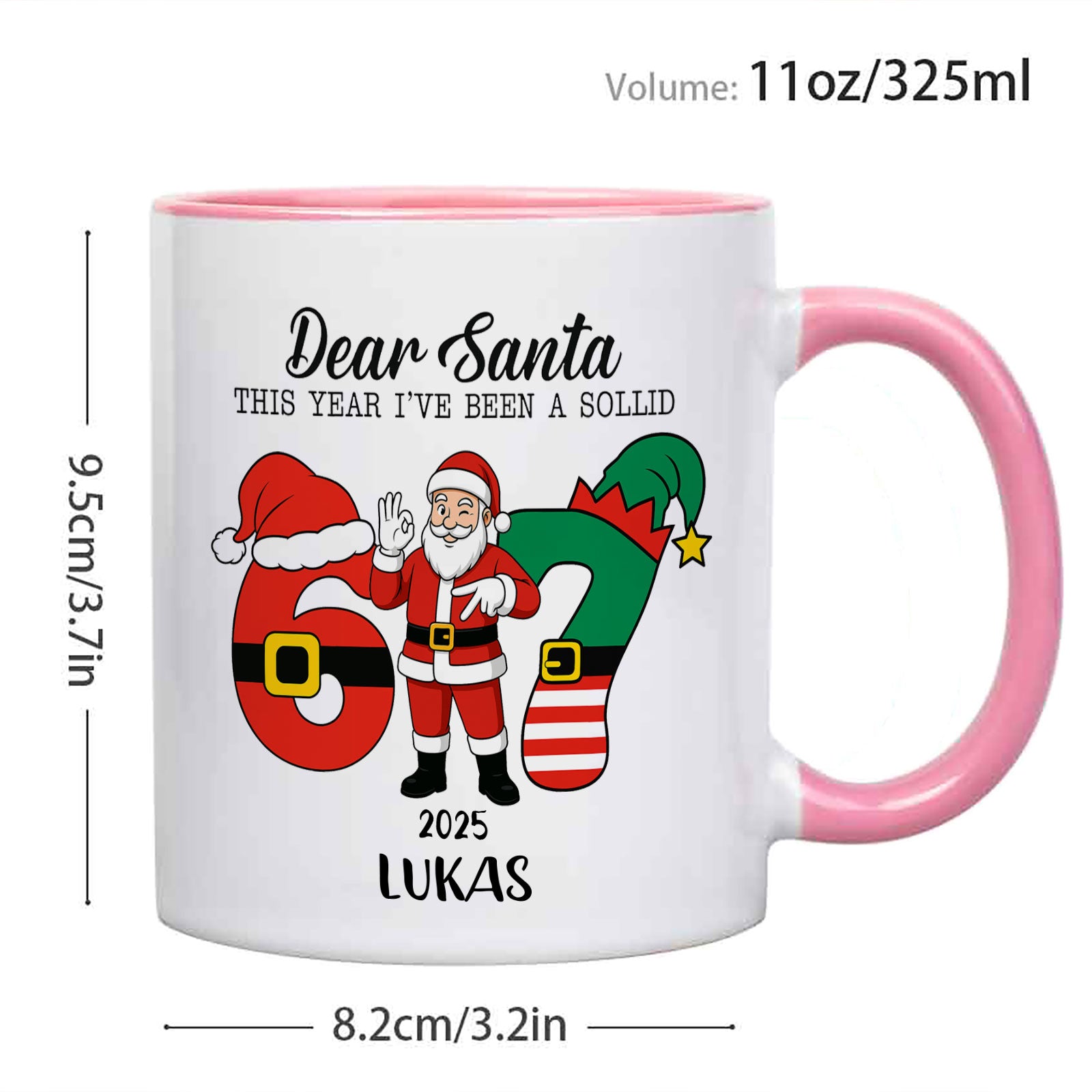 The mug’s central message, "Dear Santa, THIS YEAR I'VE BEEN A SOLID [67]," combines playful self-praise with the viral "67 Vibe." The customizable Year (2025) and Name (LUKAS) at the bottom make this a unique, annual Christmas trophy. Santa himself is featured between the '6' and '7' numerals, giving a thumbs-up and wearing the signature 67 belt buckle!